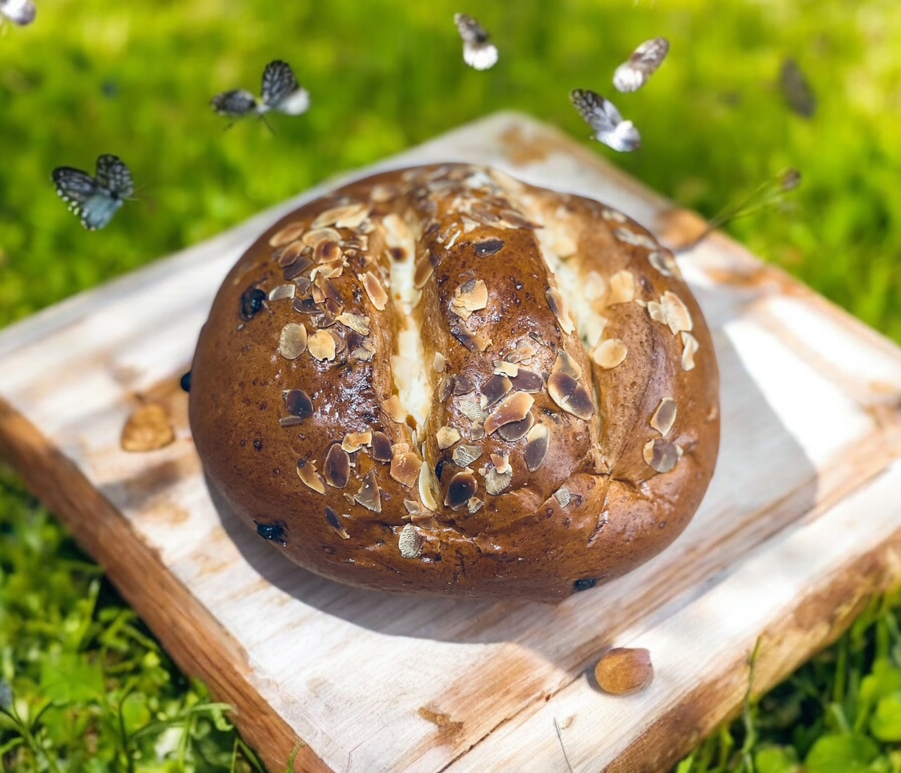 Pšeničná mouka,sádlo,cukr, čokopecičky( kakaová hmota, emulgátor E322,E471, ,droždí,sůl, emulgátor E481, E471, regulátor kyselosti E170) kyselina ascorbová, enzymy, posyp: vejce, mandle
